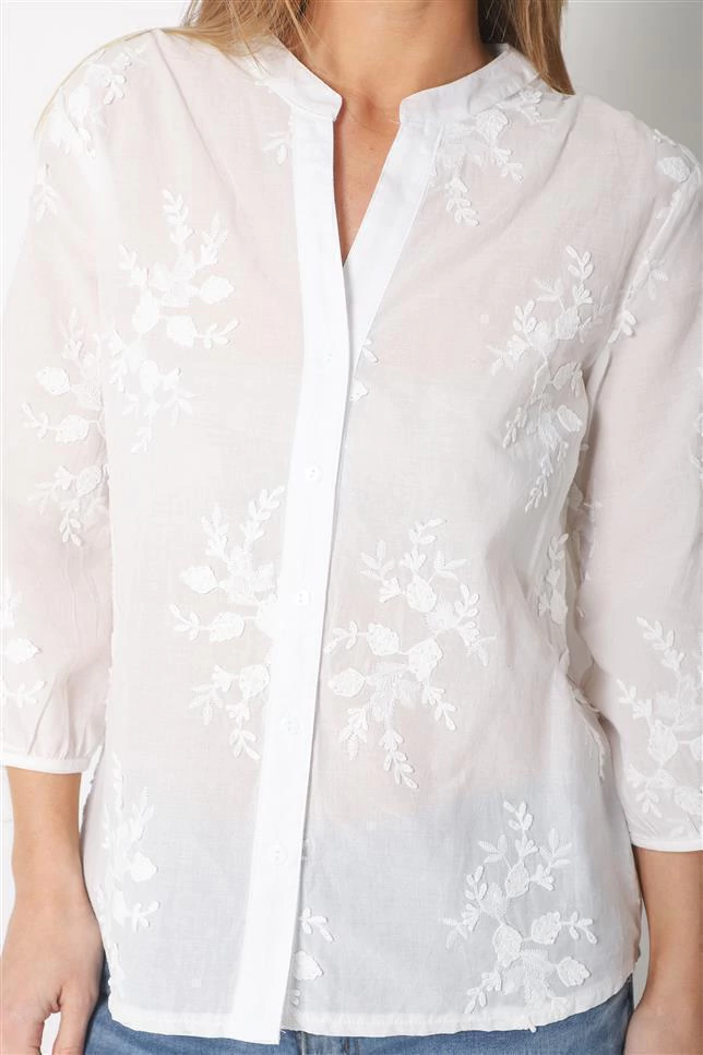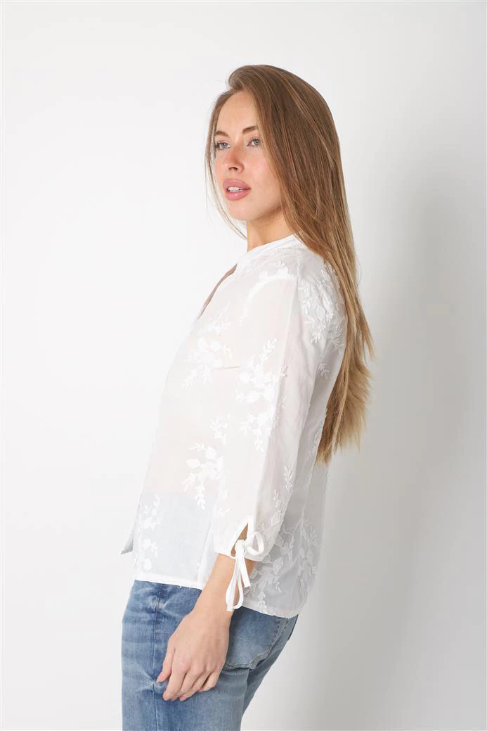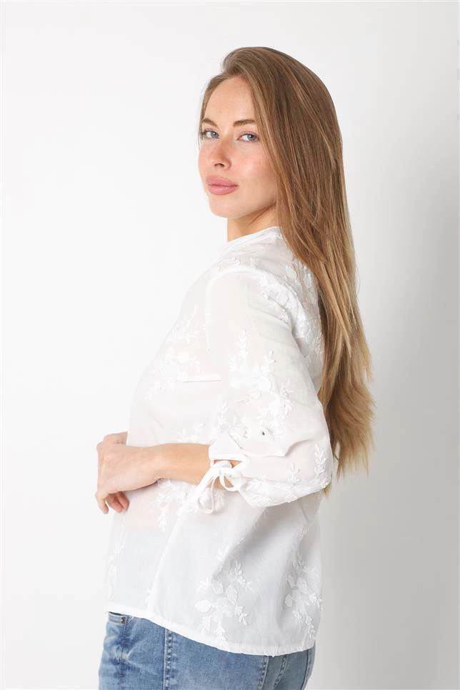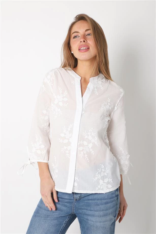 Camisa importada con flores bordadas en relieve y mangas 3/4 con lazo para moñito, un detalle súper delicado y femenino.
