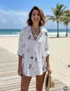 ✨ Camisa Tesalia – confeccionada en lino Luxemburgo, con estampa exclusiva de caracoles, estrellas de mar y frases en color.