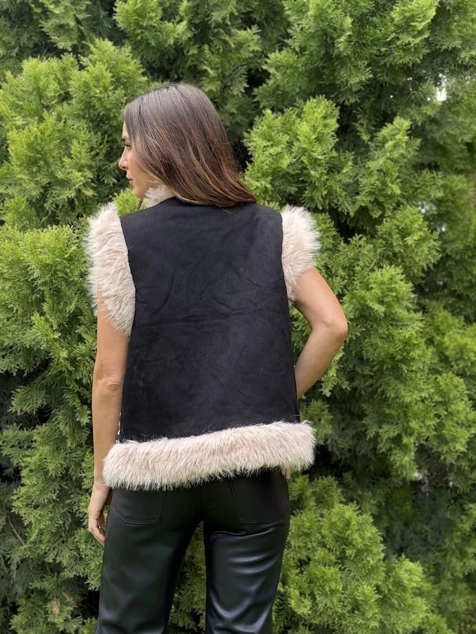 Chaleco de gamuza bordado con detalles exclusivos y terminaciones en efecto pelo, un diseño sofisticado y boho chic que combina estilo y comodidad. Ideal para looks de media estación, salidas nocturnas o para elevar un outfit casual con jeans y blusa. Prenda importada, única y de excelente calidad.